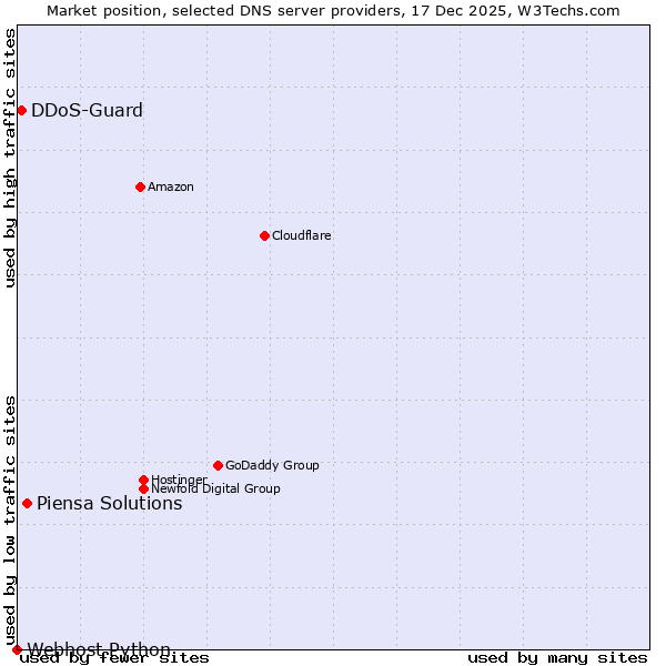 TechnologiesContent ManagementServer-side Languages Client-side Languages JavaScript Libraries CSS Frameworks Web Servers Web Panels Operating Systems Web Hosting Data Centers Reverse Proxies DNS Servers Email Servers SSL Certificate Authorities Content Delivery Traffic Analysis Tools Advertising Networks Tag Managers Social Widgets Site Elements Structured Data Markup Languages Character Encodings Image File Formats Top Level Domains Server Locations Content Languages | Technologies > DNS Servers > Technology usage comparison Comparison of the usage statistics of Piensa Solutions vs. DDoS-Guard vs. Webhost Python for websitesThis report shows the usage statistics of Piensa Solutions vs. DDoS-Guard vs. Webhost Python as DNS server provider on the web. See technologies overview for explanations on the methodologies used in the surveys. Our reports are updated daily. UsageThis diagram shows the percentages of websites using the selected technologies. How to read the diagram: