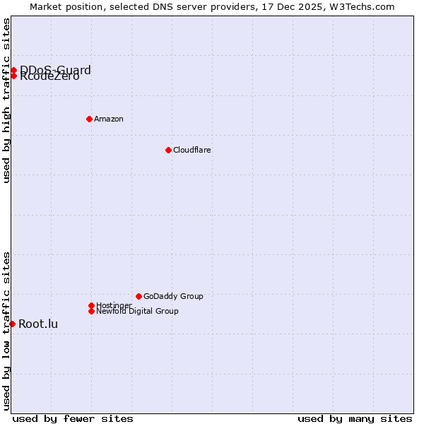 TechnologiesContent ManagementServer-side Languages Client-side Languages JavaScript Libraries CSS Frameworks Web Servers Web Panels Operating Systems Web Hosting Data Centers Reverse Proxies DNS Servers Email Servers SSL Certificate Authorities Content Delivery Traffic Analysis Tools Advertising Networks Tag Managers Social Widgets Site Elements Structured Data Markup Languages Character Encodings Image File Formats Top Level Domains Server Locations Content Languages | Technologies > DNS Servers > Technology usage comparison Comparison of the usage statistics of RcodeZero vs. DDoS-Guard vs. Root.lu for websitesThis report shows the usage statistics of RcodeZero vs. DDoS-Guard vs. Root.lu as DNS server provider on the web. See technologies overview for explanations on the methodologies used in the surveys. Our reports are updated daily. UsageThis diagram shows the percentages of websites using the selected technologies. How to read the diagram:
