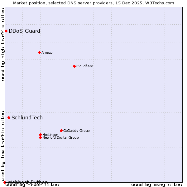TechnologiesContent ManagementServer-side Languages Client-side Languages JavaScript Libraries CSS Frameworks Web Servers Web Panels Operating Systems Web Hosting Data Centers Reverse Proxies DNS Servers Email Servers SSL Certificate Authorities Content Delivery Traffic Analysis Tools Advertising Networks Tag Managers Social Widgets Site Elements Structured Data Markup Languages Character Encodings Image File Formats Top Level Domains Server Locations Content Languages | Technologies > DNS Servers > Technology usage comparison Comparison of the usage statistics of SchlundTech vs. DDoS-Guard vs. Webhost Python for websitesThis report shows the usage statistics of SchlundTech vs. DDoS-Guard vs. Webhost Python as DNS server provider on the web. See technologies overview for explanations on the methodologies used in the surveys. Our reports are updated daily. UsageThis diagram shows the percentages of websites using the selected technologies. How to read the diagram:
