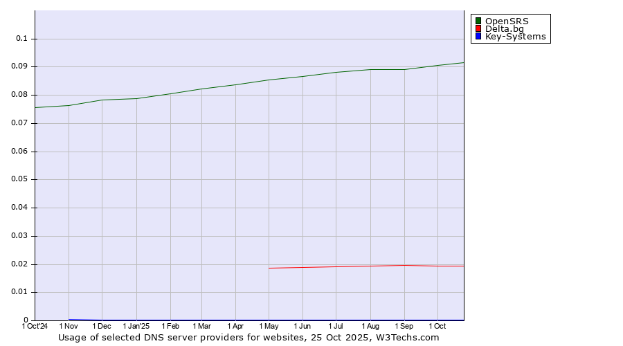 TechnologiesContent ManagementServer-side Languages Client-side Languages JavaScript Libraries CSS Frameworks Web Servers Web Panels Operating Systems Web Hosting Data Centers Reverse Proxies DNS Servers Email Servers SSL Certificate Authorities Content Delivery Traffic Analysis Tools Advertising Networks Tag Managers Social Widgets Site Elements Structured Data Markup Languages Character Encodings Image File Formats Top Level Domains Server Locations Content Languages | Technologies > DNS Servers > Technology usage comparison Comparison of the usage statistics of OpenSRS vs. Delta.bg vs. Key-Systems for websitesThis report shows the usage statistics of OpenSRS vs. Delta.bg vs. Key-Systems as DNS server provider on the web. See technologies overview for explanations on the methodologies used in the surveys. Our reports are updated daily. UsageThis diagram shows the percentages of websites using the selected technologies. How to read the diagram: