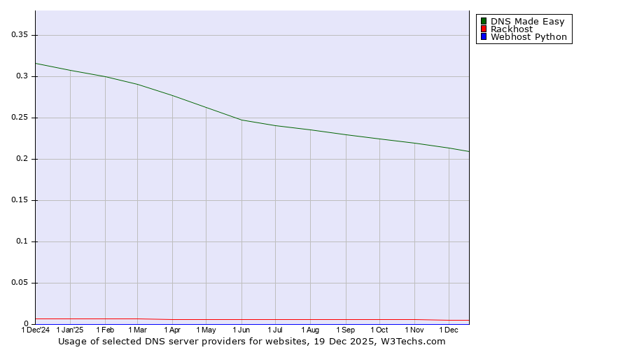 TechnologiesContent ManagementServer-side Languages Client-side Languages JavaScript Libraries CSS Frameworks Web Servers Web Panels Operating Systems Web Hosting Data Centers Reverse Proxies DNS Servers Email Servers SSL Certificate Authorities Content Delivery Traffic Analysis Tools Advertising Networks Tag Managers Social Widgets Site Elements Structured Data Markup Languages Character Encodings Image File Formats Top Level Domains Server Locations Content Languages | Technologies > DNS Servers > Technology usage comparison Comparison of the usage statistics of DNS Made Easy vs. Rackhost vs. Webhost Python for websitesThis report shows the usage statistics of DNS Made Easy vs. Rackhost vs. Webhost Python as DNS server provider on the web. See technologies overview for explanations on the methodologies used in the surveys. Our reports are updated daily. UsageThis diagram shows the percentages of websites using the selected technologies. How to read the diagram: