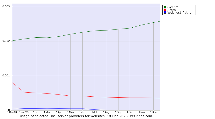 TechnologiesContent ManagementServer-side Languages Client-side Languages JavaScript Libraries CSS Frameworks Web Servers Web Panels Operating Systems Web Hosting Data Centers Reverse Proxies DNS Servers Email Servers SSL Certificate Authorities Content Delivery Traffic Analysis Tools Advertising Networks Tag Managers Social Widgets Site Elements Structured Data Markup Languages Character Encodings Image File Formats Top Level Domains Server Locations Content Languages | Technologies > DNS Servers > Technology usage comparison Comparison of the usage statistics of deSEC vs. Sfera vs. Webhost Python for websitesThis report shows the usage statistics of deSEC vs. Sfera vs. Webhost Python as DNS server provider on the web. See technologies overview for explanations on the methodologies used in the surveys. Our reports are updated daily. UsageThis diagram shows the percentages of websites using the selected technologies. How to read the diagram: