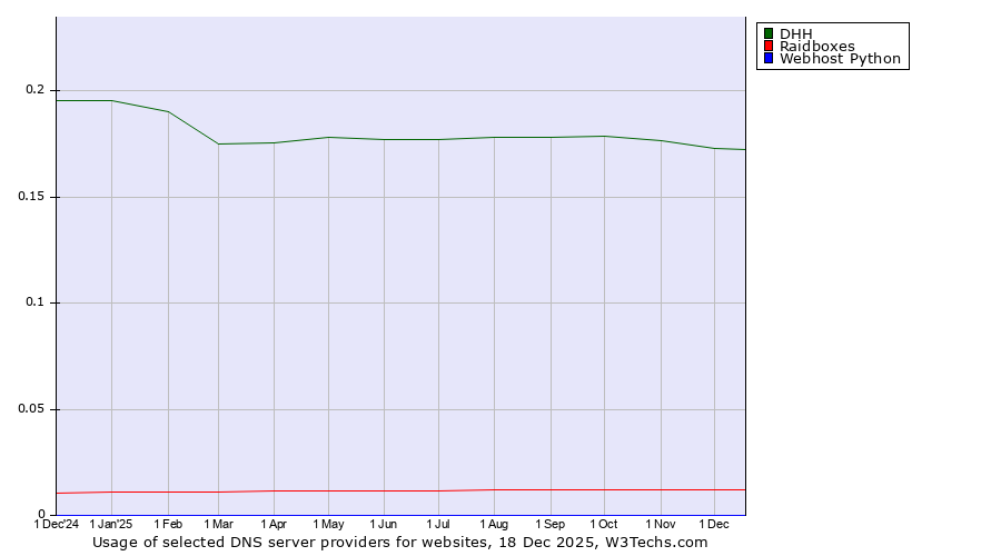 TechnologiesContent ManagementServer-side Languages Client-side Languages JavaScript Libraries CSS Frameworks Web Servers Web Panels Operating Systems Web Hosting Data Centers Reverse Proxies DNS Servers Email Servers SSL Certificate Authorities Content Delivery Traffic Analysis Tools Advertising Networks Tag Managers Social Widgets Site Elements Structured Data Markup Languages Character Encodings Image File Formats Top Level Domains Server Locations Content Languages | Technologies > DNS Servers > Technology usage comparison Comparison of the usage statistics of DHH vs. Raidboxes vs. Webhost Python for websitesThis report shows the usage statistics of DHH vs. Raidboxes vs. Webhost Python as DNS server provider on the web. See technologies overview for explanations on the methodologies used in the surveys. Our reports are updated daily. UsageThis diagram shows the percentages of websites using the selected technologies. How to read the diagram: