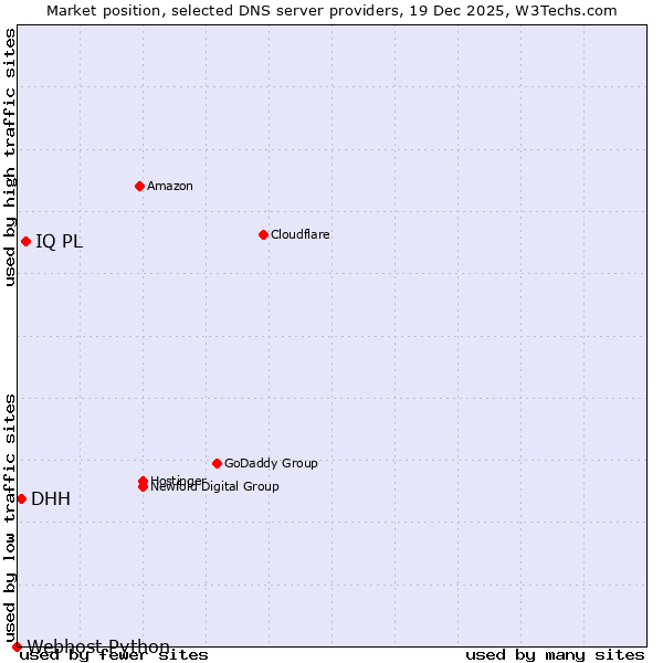 TechnologiesContent ManagementServer-side Languages Client-side Languages JavaScript Libraries CSS Frameworks Web Servers Web Panels Operating Systems Web Hosting Data Centers Reverse Proxies DNS Servers Email Servers SSL Certificate Authorities Content Delivery Traffic Analysis Tools Advertising Networks Tag Managers Social Widgets Site Elements Structured Data Markup Languages Character Encodings Image File Formats Top Level Domains Server Locations Content Languages | Technologies > DNS Servers > Technology usage comparison Comparison of the usage statistics of IQ PL vs. DHH vs. Webhost Python for websitesThis report shows the usage statistics of IQ PL vs. DHH vs. Webhost Python as DNS server provider on the web. See technologies overview for explanations on the methodologies used in the surveys. Our reports are updated daily. UsageThis diagram shows the percentages of websites using the selected technologies. How to read the diagram: