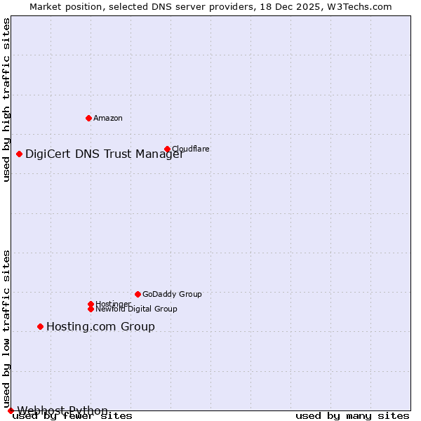 TechnologiesContent ManagementServer-side Languages Client-side Languages JavaScript Libraries CSS Frameworks Web Servers Web Panels Operating Systems Web Hosting Data Centers Reverse Proxies DNS Servers Email Servers SSL Certificate Authorities Content Delivery Traffic Analysis Tools Advertising Networks Tag Managers Social Widgets Site Elements Structured Data Markup Languages Character Encodings Image File Formats Top Level Domains Server Locations Content Languages | Technologies > DNS Servers > Technology usage comparison Comparison of the usage statistics of Hosting.com Group vs. DigiCert DNS Trust Manager vs. Webhost Python for websitesThis report shows the usage statistics of Hosting.com Group vs. DigiCert DNS Trust Manager vs. Webhost Python as DNS server provider on the web. See technologies overview for explanations on the methodologies used in the surveys. Our reports are updated daily. UsageThis diagram shows the percentages of websites using the selected technologies. How to read the diagram: