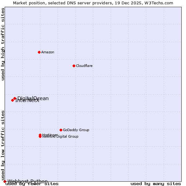 TechnologiesContent ManagementServer-side Languages Client-side Languages JavaScript Libraries CSS Frameworks Web Servers Web Panels Operating Systems Web Hosting Data Centers Reverse Proxies DNS Servers Email Servers SSL Certificate Authorities Content Delivery Traffic Analysis Tools Advertising Networks Tag Managers Social Widgets Site Elements Structured Data Markup Languages Character Encodings Image File Formats Top Level Domains Server Locations Content Languages | Technologies > DNS Servers > Technology usage comparison Comparison of the usage statistics of DigitalOcean vs. InterNetX vs. Webhost Python for websitesThis report shows the usage statistics of DigitalOcean vs. InterNetX vs. Webhost Python as DNS server provider on the web. See technologies overview for explanations on the methodologies used in the surveys. Our reports are updated daily. UsageThis diagram shows the percentages of websites using the selected technologies. How to read the diagram: