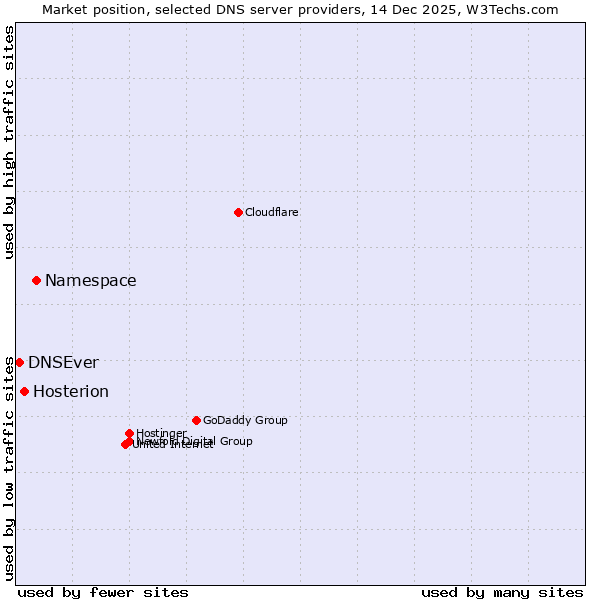 TechnologiesContent ManagementServer-side Languages Client-side Languages JavaScript Libraries CSS Frameworks Web Servers Web Panels Operating Systems Web Hosting Data Centers Reverse Proxies DNS Servers Email Servers SSL Certificate Authorities Content Delivery Traffic Analysis Tools Advertising Networks Tag Managers Social Widgets Site Elements Structured Data Markup Languages Character Encodings Image File Formats Top Level Domains Server Locations Content Languages | Technologies > DNS Servers > Technology usage comparison Comparison of the usage statistics of Namespace vs. Hosterion vs. DNSEver for websitesThis report shows the usage statistics of Namespace vs. Hosterion vs. DNSEver as DNS server provider on the web. See technologies overview for explanations on the methodologies used in the surveys. Our reports are updated daily. UsageThis diagram shows the percentages of websites using the selected technologies. How to read the diagram: