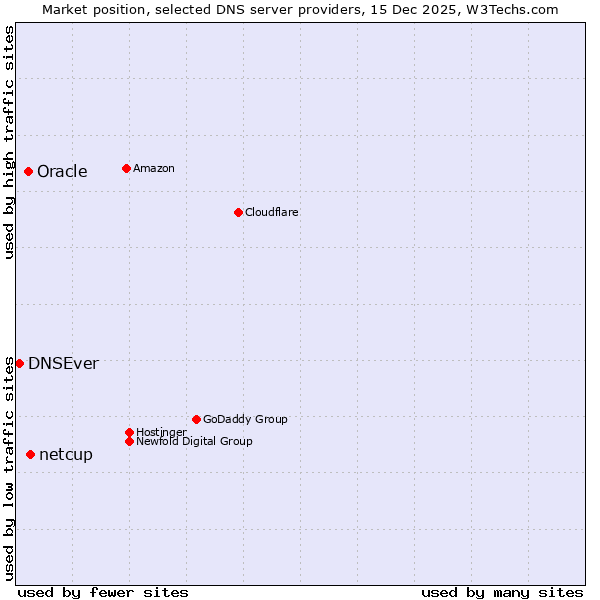 TechnologiesContent ManagementServer-side Languages Client-side Languages JavaScript Libraries CSS Frameworks Web Servers Web Panels Operating Systems Web Hosting Data Centers Reverse Proxies DNS Servers Email Servers SSL Certificate Authorities Content Delivery Traffic Analysis Tools Advertising Networks Tag Managers Social Widgets Site Elements Structured Data Markup Languages Character Encodings Image File Formats Top Level Domains Server Locations Content Languages | Technologies > DNS Servers > Technology usage comparison Comparison of the usage statistics of netcup vs. Oracle vs. DNSEver for websitesThis report shows the usage statistics of netcup vs. Oracle vs. DNSEver as DNS server provider on the web. See technologies overview for explanations on the methodologies used in the surveys. Our reports are updated daily. UsageThis diagram shows the percentages of websites using the selected technologies. How to read the diagram: