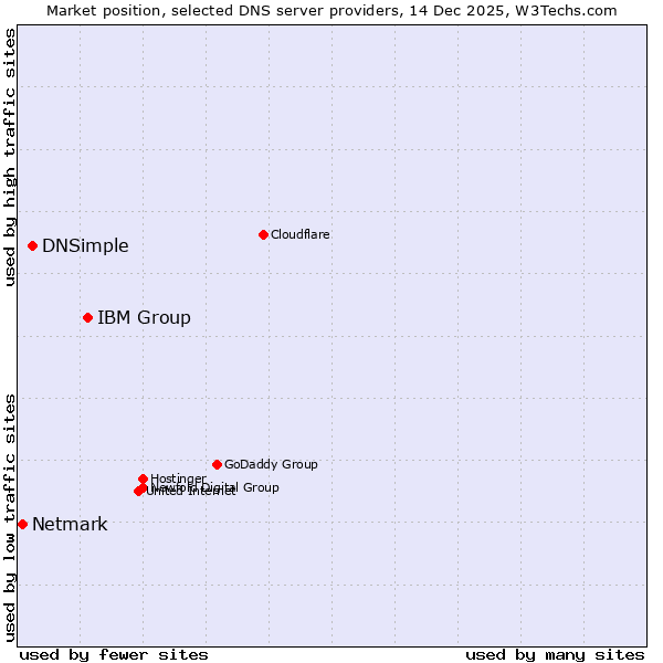 TechnologiesContent ManagementServer-side Languages Client-side Languages JavaScript Libraries CSS Frameworks Web Servers Web Panels Operating Systems Web Hosting Data Centers Reverse Proxies DNS Servers Email Servers SSL Certificate Authorities Content Delivery Traffic Analysis Tools Advertising Networks Tag Managers Social Widgets Site Elements Structured Data Markup Languages Character Encodings Image File Formats Top Level Domains Server Locations Content Languages | Technologies > DNS Servers > Technology usage comparison Comparison of the usage statistics of IBM Group vs. DNSimple vs. Netmark for websitesThis report shows the usage statistics of IBM Group vs. DNSimple vs. Netmark as DNS server provider on the web. See technologies overview for explanations on the methodologies used in the surveys. Our reports are updated daily. UsageThis diagram shows the percentages of websites using the selected technologies. How to read the diagram: