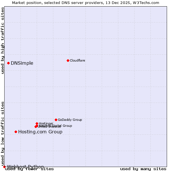 TechnologiesContent ManagementServer-side Languages Client-side Languages JavaScript Libraries CSS Frameworks Web Servers Web Panels Operating Systems Web Hosting Data Centers Reverse Proxies DNS Servers Email Servers SSL Certificate Authorities Content Delivery Traffic Analysis Tools Advertising Networks Tag Managers Social Widgets Site Elements Structured Data Markup Languages Character Encodings Image File Formats Top Level Domains Server Locations Content Languages | Technologies > DNS Servers > Technology usage comparison Comparison of the usage statistics of Hosting.com Group vs. DNSimple vs. Webhost Python for websitesThis report shows the usage statistics of Hosting.com Group vs. DNSimple vs. Webhost Python as DNS server provider on the web. See technologies overview for explanations on the methodologies used in the surveys. Our reports are updated daily. UsageThis diagram shows the percentages of websites using the selected technologies. How to read the diagram: