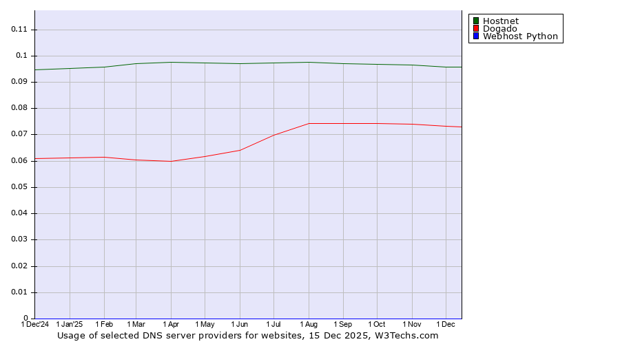 TechnologiesContent ManagementServer-side Languages Client-side Languages JavaScript Libraries CSS Frameworks Web Servers Web Panels Operating Systems Web Hosting Data Centers Reverse Proxies DNS Servers Email Servers SSL Certificate Authorities Content Delivery Traffic Analysis Tools Advertising Networks Tag Managers Social Widgets Site Elements Structured Data Markup Languages Character Encodings Image File Formats Top Level Domains Server Locations Content Languages | Technologies > DNS Servers > Technology usage comparison Comparison of the usage statistics of Hostnet vs. Dogado vs. Webhost Python for websitesThis report shows the usage statistics of Hostnet vs. Dogado vs. Webhost Python as DNS server provider on the web. See technologies overview for explanations on the methodologies used in the surveys. Our reports are updated daily. UsageThis diagram shows the percentages of websites using the selected technologies. How to read the diagram:
