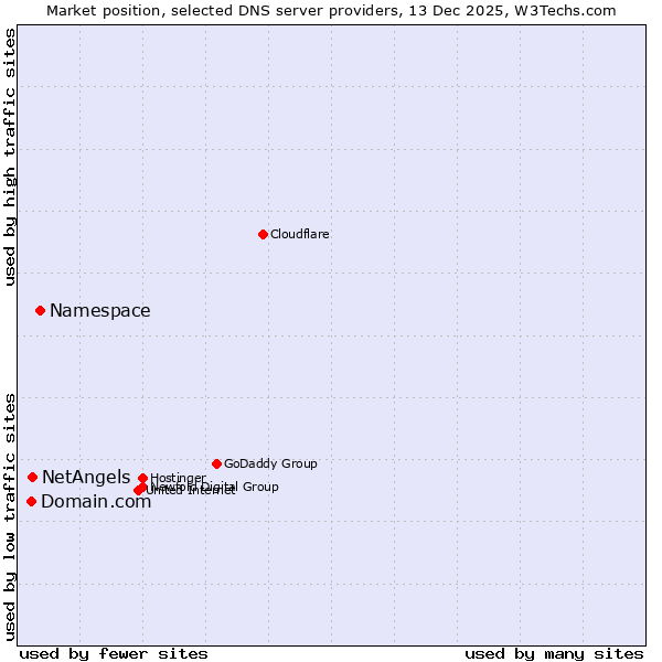 TechnologiesContent ManagementServer-side Languages Client-side Languages JavaScript Libraries CSS Frameworks Web Servers Web Panels Operating Systems Web Hosting Data Centers Reverse Proxies DNS Servers Email Servers SSL Certificate Authorities Content Delivery Traffic Analysis Tools Advertising Networks Tag Managers Social Widgets Site Elements Structured Data Markup Languages Character Encodings Image File Formats Top Level Domains Server Locations Content Languages | Technologies > DNS Servers > Technology usage comparison Comparison of the usage statistics of Namespace vs. NetAngels vs. Domain.com for websitesThis report shows the usage statistics of Namespace vs. NetAngels vs. Domain.com as DNS server provider on the web. See technologies overview for explanations on the methodologies used in the surveys. Our reports are updated daily. UsageThis diagram shows the percentages of websites using the selected technologies. How to read the diagram: