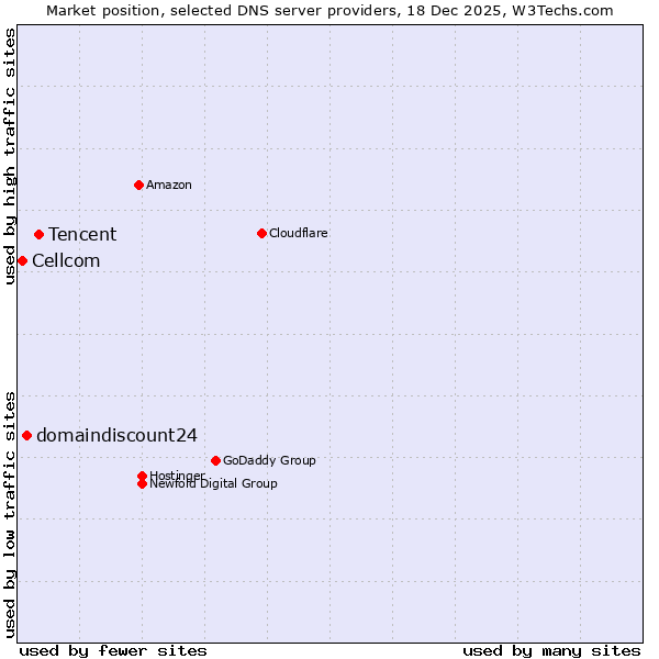 TechnologiesContent ManagementServer-side Languages Client-side Languages JavaScript Libraries CSS Frameworks Web Servers Web Panels Operating Systems Web Hosting Data Centers Reverse Proxies DNS Servers Email Servers SSL Certificate Authorities Content Delivery Traffic Analysis Tools Advertising Networks Tag Managers Social Widgets Site Elements Structured Data Markup Languages Character Encodings Image File Formats Top Level Domains Server Locations Content Languages | Technologies > DNS Servers > Technology usage comparison Comparison of the usage statistics of Tencent vs. domaindiscount24 vs. Cellcom for websitesThis report shows the usage statistics of Tencent vs. domaindiscount24 vs. Cellcom as DNS server provider on the web. See technologies overview for explanations on the methodologies used in the surveys. Our reports are updated daily. UsageThis diagram shows the percentages of websites using the selected technologies. How to read the diagram:
