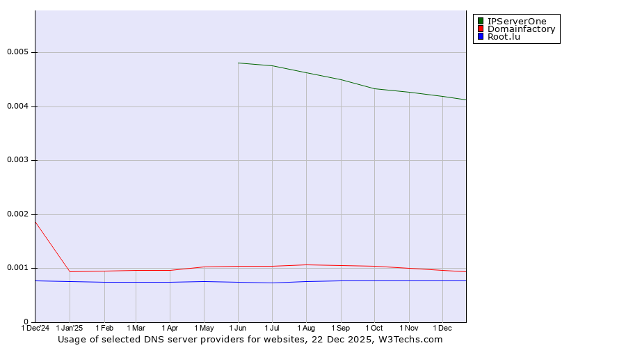 TechnologiesContent ManagementServer-side Languages Client-side Languages JavaScript Libraries CSS Frameworks Web Servers Web Panels Operating Systems Web Hosting Data Centers Reverse Proxies DNS Servers Email Servers SSL Certificate Authorities Content Delivery Traffic Analysis Tools Advertising Networks Tag Managers Social Widgets Site Elements Structured Data Markup Languages Character Encodings Image File Formats Top Level Domains Server Locations Content Languages | Technologies > DNS Servers > Technology usage comparison Comparison of the usage statistics of IPServerOne vs. Domainfactory vs. Root.lu for websitesThis report shows the usage statistics of IPServerOne vs. Domainfactory vs. Root.lu as DNS server provider on the web. See technologies overview for explanations on the methodologies used in the surveys. Our reports are updated daily. UsageThis diagram shows the percentages of websites using the selected technologies. How to read the diagram: