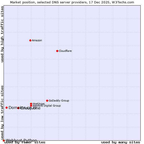 TechnologiesContent ManagementServer-side Languages Client-side Languages JavaScript Libraries CSS Frameworks Web Servers Web Panels Operating Systems Web Hosting Data Centers Reverse Proxies DNS Servers Email Servers SSL Certificate Authorities Content Delivery Traffic Analysis Tools Advertising Networks Tag Managers Social Widgets Site Elements Structured Data Markup Languages Character Encodings Image File Formats Top Level Domains Server Locations Content Languages | Technologies > DNS Servers > Technology usage comparison Comparison of the usage statistics of Group.one vs. Domains.co.za vs. Webhost Python for websitesThis report shows the usage statistics of Group.one vs. Domains.co.za vs. Webhost Python as DNS server provider on the web. See technologies overview for explanations on the methodologies used in the surveys. Our reports are updated daily. UsageThis diagram shows the percentages of websites using the selected technologies. How to read the diagram: