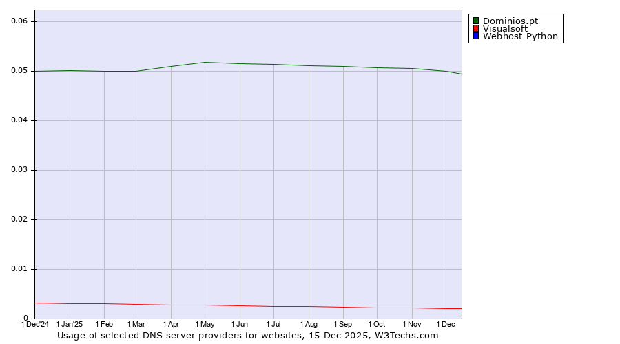 TechnologiesContent ManagementServer-side Languages Client-side Languages JavaScript Libraries CSS Frameworks Web Servers Web Panels Operating Systems Web Hosting Data Centers Reverse Proxies DNS Servers Email Servers SSL Certificate Authorities Content Delivery Traffic Analysis Tools Advertising Networks Tag Managers Social Widgets Site Elements Structured Data Markup Languages Character Encodings Image File Formats Top Level Domains Server Locations Content Languages | Technologies > DNS Servers > Technology usage comparison Comparison of the usage statistics of Dominios.pt vs. Visualsoft vs. Webhost Python for websitesThis report shows the usage statistics of Dominios.pt vs. Visualsoft vs. Webhost Python as DNS server provider on the web. See technologies overview for explanations on the methodologies used in the surveys. Our reports are updated daily. UsageThis diagram shows the percentages of websites using the selected technologies. How to read the diagram: