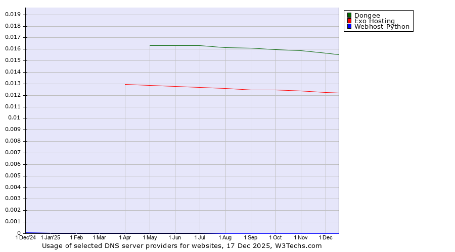 TechnologiesContent ManagementServer-side Languages Client-side Languages JavaScript Libraries CSS Frameworks Web Servers Web Panels Operating Systems Web Hosting Data Centers Reverse Proxies DNS Servers Email Servers SSL Certificate Authorities Content Delivery Traffic Analysis Tools Advertising Networks Tag Managers Social Widgets Site Elements Structured Data Markup Languages Character Encodings Image File Formats Top Level Domains Server Locations Content Languages | Technologies > DNS Servers > Technology usage comparison Comparison of the usage statistics of Dongee vs. Exo Hosting vs. Webhost Python for websitesThis report shows the usage statistics of Dongee vs. Exo Hosting vs. Webhost Python as DNS server provider on the web. See technologies overview for explanations on the methodologies used in the surveys. Our reports are updated daily. UsageThis diagram shows the percentages of websites using the selected technologies. How to read the diagram: