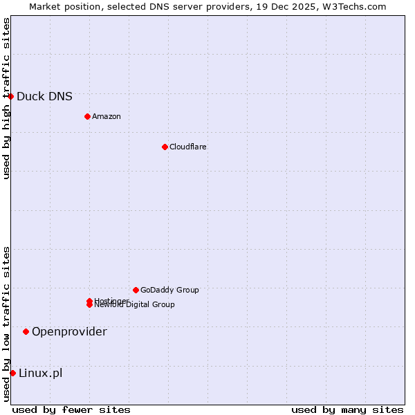 TechnologiesContent ManagementServer-side Languages Client-side Languages JavaScript Libraries CSS Frameworks Web Servers Web Panels Operating Systems Web Hosting Data Centers Reverse Proxies DNS Servers Email Servers SSL Certificate Authorities Content Delivery Traffic Analysis Tools Advertising Networks Tag Managers Social Widgets Site Elements Structured Data Markup Languages Character Encodings Image File Formats Top Level Domains Server Locations Content Languages | Technologies > DNS Servers > Technology usage comparison Comparison of the usage statistics of Openprovider vs. Linux.pl vs. Duck DNS for websitesThis report shows the usage statistics of Openprovider vs. Linux.pl vs. Duck DNS as DNS server provider on the web. See technologies overview for explanations on the methodologies used in the surveys. Our reports are updated daily. UsageThis diagram shows the percentages of websites using the selected technologies. How to read the diagram: