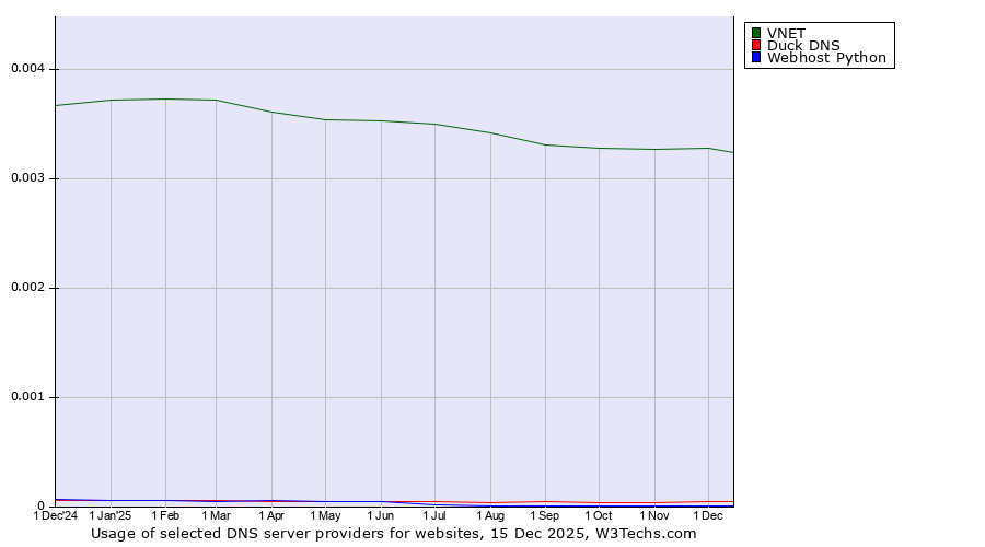 TechnologiesContent ManagementServer-side Languages Client-side Languages JavaScript Libraries CSS Frameworks Web Servers Web Panels Operating Systems Web Hosting Data Centers Reverse Proxies DNS Servers Email Servers SSL Certificate Authorities Content Delivery Traffic Analysis Tools Advertising Networks Tag Managers Social Widgets Site Elements Structured Data Markup Languages Character Encodings Image File Formats Top Level Domains Server Locations Content Languages | Technologies > DNS Servers > Technology usage comparison Comparison of the usage statistics of VNET vs. Duck DNS vs. Webhost Python for websitesThis report shows the usage statistics of VNET vs. Duck DNS vs. Webhost Python as DNS server provider on the web. See technologies overview for explanations on the methodologies used in the surveys. Our reports are updated daily. UsageThis diagram shows the percentages of websites using the selected technologies. How to read the diagram: