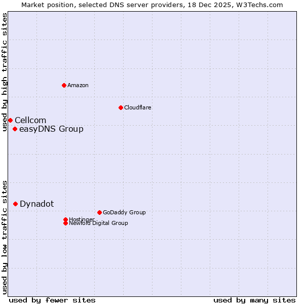 TechnologiesContent ManagementServer-side Languages Client-side Languages JavaScript Libraries CSS Frameworks Web Servers Web Panels Operating Systems Web Hosting Data Centers Reverse Proxies DNS Servers Email Servers SSL Certificate Authorities Content Delivery Traffic Analysis Tools Advertising Networks Tag Managers Social Widgets Site Elements Structured Data Markup Languages Character Encodings Image File Formats Top Level Domains Server Locations Content Languages | Technologies > DNS Servers > Technology usage comparison Comparison of the usage statistics of Dynadot vs. easyDNS Group vs. Cellcom for websitesThis report shows the usage statistics of Dynadot vs. easyDNS Group vs. Cellcom as DNS server provider on the web. See technologies overview for explanations on the methodologies used in the surveys. Our reports are updated daily. UsageThis diagram shows the percentages of websites using the selected technologies. How to read the diagram: