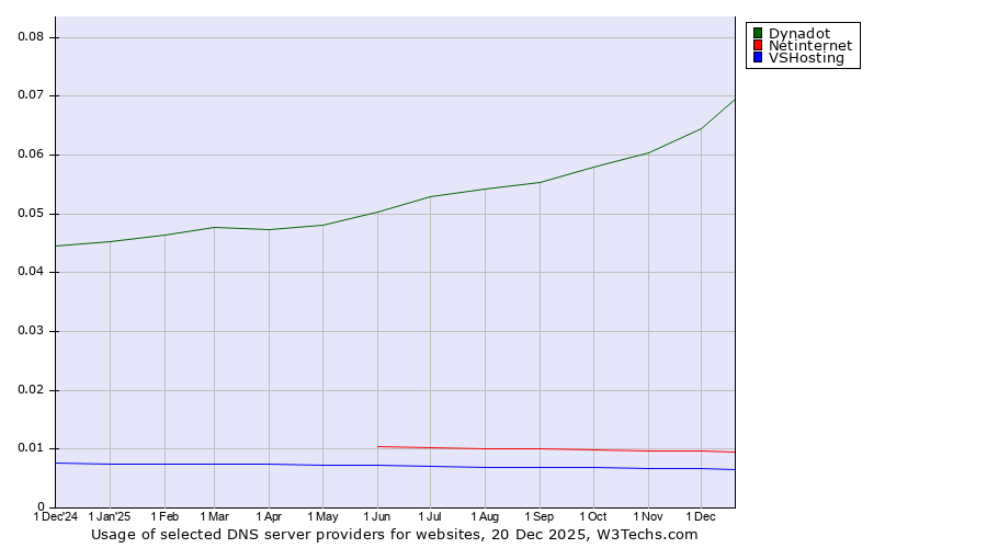 TechnologiesContent ManagementServer-side Languages Client-side Languages JavaScript Libraries CSS Frameworks Web Servers Web Panels Operating Systems Web Hosting Data Centers Reverse Proxies DNS Servers Email Servers SSL Certificate Authorities Content Delivery Traffic Analysis Tools Advertising Networks Tag Managers Social Widgets Site Elements Structured Data Markup Languages Character Encodings Image File Formats Top Level Domains Server Locations Content Languages | Technologies > DNS Servers > Technology usage comparison Comparison of the usage statistics of Dynadot vs. Netinternet vs. VSHosting for websitesThis report shows the usage statistics of Dynadot vs. Netinternet vs. VSHosting as DNS server provider on the web. See technologies overview for explanations on the methodologies used in the surveys. Our reports are updated daily. UsageThis diagram shows the percentages of websites using the selected technologies. How to read the diagram: