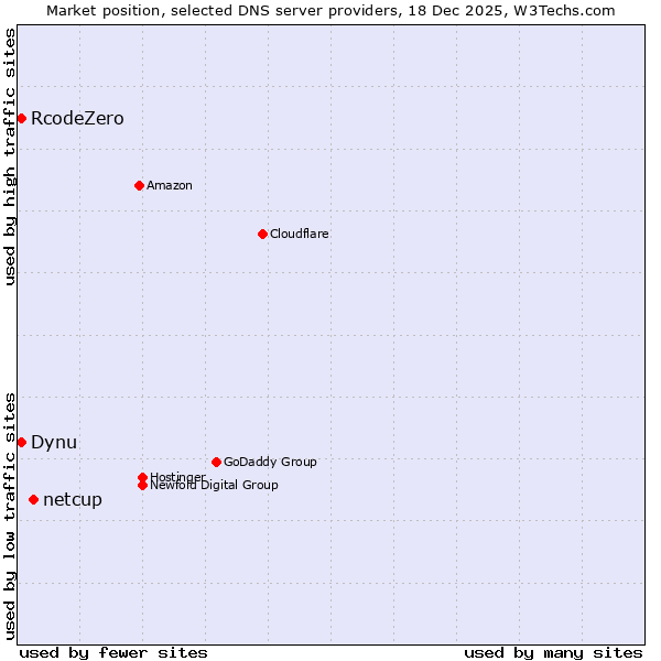 TechnologiesContent ManagementServer-side Languages Client-side Languages JavaScript Libraries CSS Frameworks Web Servers Web Panels Operating Systems Web Hosting Data Centers Reverse Proxies DNS Servers Email Servers SSL Certificate Authorities Content Delivery Traffic Analysis Tools Advertising Networks Tag Managers Social Widgets Site Elements Structured Data Markup Languages Character Encodings Image File Formats Top Level Domains Server Locations Content Languages | Technologies > DNS Servers > Technology usage comparison Comparison of the usage statistics of netcup vs. RcodeZero vs. Dynu for websitesThis report shows the usage statistics of netcup vs. RcodeZero vs. Dynu as DNS server provider on the web. See technologies overview for explanations on the methodologies used in the surveys. Our reports are updated daily. UsageThis diagram shows the percentages of websites using the selected technologies. How to read the diagram: