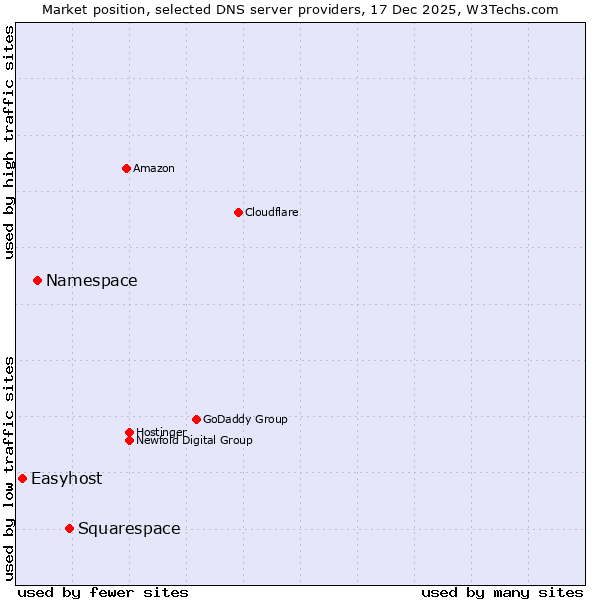 TechnologiesContent ManagementServer-side Languages Client-side Languages JavaScript Libraries CSS Frameworks Web Servers Web Panels Operating Systems Web Hosting Data Centers Reverse Proxies DNS Servers Email Servers SSL Certificate Authorities Content Delivery Traffic Analysis Tools Advertising Networks Tag Managers Social Widgets Site Elements Structured Data Markup Languages Character Encodings Image File Formats Top Level Domains Server Locations Content Languages | Technologies > DNS Servers > Technology usage comparison Comparison of the usage statistics of Squarespace vs. Namespace vs. Easyhost for websitesThis report shows the usage statistics of Squarespace vs. Namespace vs. Easyhost as DNS server provider on the web. See technologies overview for explanations on the methodologies used in the surveys. Our reports are updated daily. UsageThis diagram shows the percentages of websites using the selected technologies. How to read the diagram: