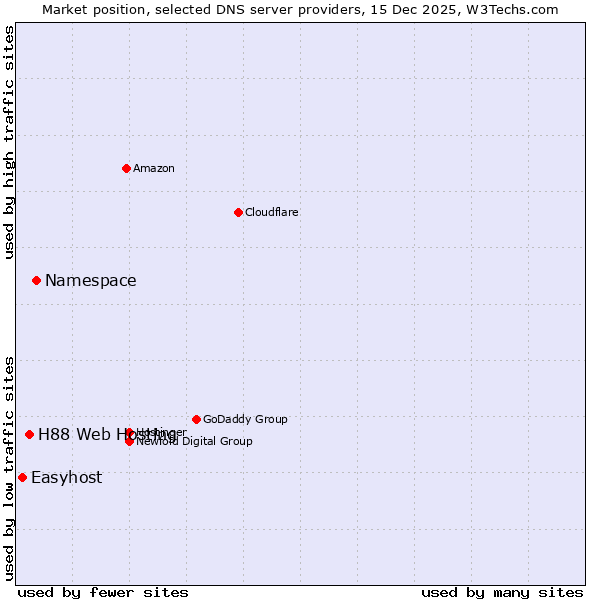 TechnologiesContent ManagementServer-side Languages Client-side Languages JavaScript Libraries CSS Frameworks Web Servers Web Panels Operating Systems Web Hosting Data Centers Reverse Proxies DNS Servers Email Servers SSL Certificate Authorities Content Delivery Traffic Analysis Tools Advertising Networks Tag Managers Social Widgets Site Elements Structured Data Markup Languages Character Encodings Image File Formats Top Level Domains Server Locations Content Languages | Technologies > DNS Servers > Technology usage comparison Comparison of the usage statistics of Namespace vs. H88 Web Hosting vs. Easyhost for websitesThis report shows the usage statistics of Namespace vs. H88 Web Hosting vs. Easyhost as DNS server provider on the web. See technologies overview for explanations on the methodologies used in the surveys. Our reports are updated daily. UsageThis diagram shows the percentages of websites using the selected technologies. How to read the diagram: