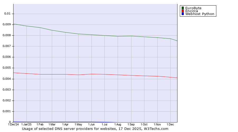 TechnologiesContent ManagementServer-side Languages Client-side Languages JavaScript Libraries CSS Frameworks Web Servers Web Panels Operating Systems Web Hosting Data Centers Reverse Proxies DNS Servers Email Servers SSL Certificate Authorities Content Delivery Traffic Analysis Tools Advertising Networks Tag Managers Social Widgets Site Elements Structured Data Markup Languages Character Encodings Image File Formats Top Level Domains Server Locations Content Languages | Technologies > DNS Servers > Technology usage comparison Comparison of the usage statistics of EuroByte vs. Encirca vs. Webhost Python for websitesThis report shows the usage statistics of EuroByte vs. Encirca vs. Webhost Python as DNS server provider on the web. See technologies overview for explanations on the methodologies used in the surveys. Our reports are updated daily. UsageThis diagram shows the percentages of websites using the selected technologies. How to read the diagram: