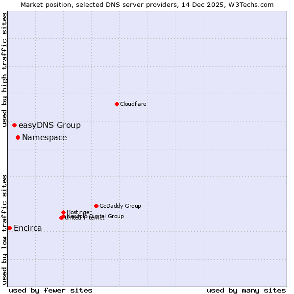 TechnologiesContent ManagementServer-side Languages Client-side Languages JavaScript Libraries CSS Frameworks Web Servers Web Panels Operating Systems Web Hosting Data Centers Reverse Proxies DNS Servers Email Servers SSL Certificate Authorities Content Delivery Traffic Analysis Tools Advertising Networks Tag Managers Social Widgets Site Elements Structured Data Markup Languages Character Encodings Image File Formats Top Level Domains Server Locations Content Languages | Technologies > DNS Servers > Technology usage comparison Comparison of the usage statistics of Namespace vs. easyDNS Group vs. Encirca for websitesThis report shows the usage statistics of Namespace vs. easyDNS Group vs. Encirca as DNS server provider on the web. See technologies overview for explanations on the methodologies used in the surveys. Our reports are updated daily. UsageThis diagram shows the percentages of websites using the selected technologies. How to read the diagram: