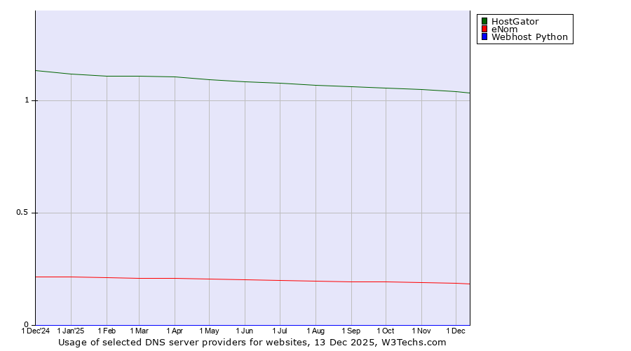 TechnologiesContent ManagementServer-side Languages Client-side Languages JavaScript Libraries CSS Frameworks Web Servers Web Panels Operating Systems Web Hosting Data Centers Reverse Proxies DNS Servers Email Servers SSL Certificate Authorities Content Delivery Traffic Analysis Tools Advertising Networks Tag Managers Social Widgets Site Elements Structured Data Markup Languages Character Encodings Image File Formats Top Level Domains Server Locations Content Languages | Technologies > DNS Servers > Technology usage comparison Comparison of the usage statistics of HostGator vs. eNom vs. Webhost Python for websitesThis report shows the usage statistics of HostGator vs. eNom vs. Webhost Python as DNS server provider on the web. See technologies overview for explanations on the methodologies used in the surveys. Our reports are updated daily. UsageThis diagram shows the percentages of websites using the selected technologies. How to read the diagram: