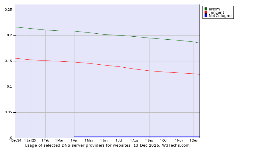 TechnologiesContent ManagementServer-side Languages Client-side Languages JavaScript Libraries CSS Frameworks Web Servers Web Panels Operating Systems Web Hosting Data Centers Reverse Proxies DNS Servers Email Servers SSL Certificate Authorities Content Delivery Traffic Analysis Tools Advertising Networks Tag Managers Social Widgets Site Elements Structured Data Markup Languages Character Encodings Image File Formats Top Level Domains Server Locations Content Languages | Technologies > DNS Servers > Technology usage comparison Comparison of the usage statistics of eNom vs. Tencent vs. NetCologne for websitesThis report shows the usage statistics of eNom vs. Tencent vs. NetCologne as DNS server provider on the web. See technologies overview for explanations on the methodologies used in the surveys. Our reports are updated daily. UsageThis diagram shows the percentages of websites using the selected technologies. How to read the diagram: