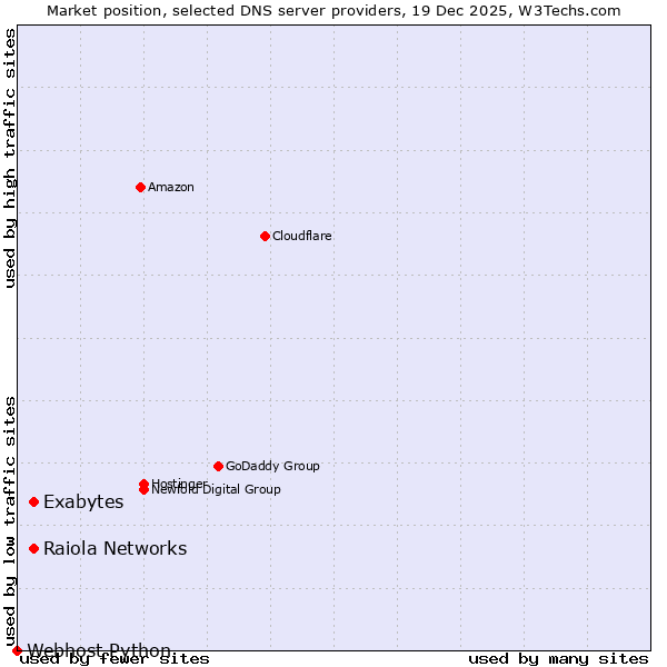 TechnologiesContent ManagementServer-side Languages Client-side Languages JavaScript Libraries CSS Frameworks Web Servers Web Panels Operating Systems Web Hosting Data Centers Reverse Proxies DNS Servers Email Servers SSL Certificate Authorities Content Delivery Traffic Analysis Tools Advertising Networks Tag Managers Social Widgets Site Elements Structured Data Markup Languages Character Encodings Image File Formats Top Level Domains Server Locations Content Languages | Technologies > DNS Servers > Technology usage comparison Comparison of the usage statistics of Exabytes vs. Raiola Networks vs. Webhost Python for websitesThis report shows the usage statistics of Exabytes vs. Raiola Networks vs. Webhost Python as DNS server provider on the web. See technologies overview for explanations on the methodologies used in the surveys. Our reports are updated daily. UsageThis diagram shows the percentages of websites using the selected technologies. How to read the diagram: