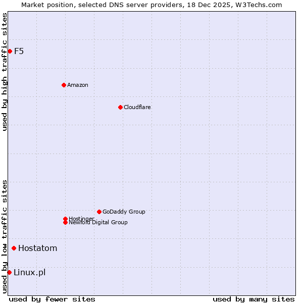 TechnologiesContent ManagementServer-side Languages Client-side Languages JavaScript Libraries CSS Frameworks Web Servers Web Panels Operating Systems Web Hosting Data Centers Reverse Proxies DNS Servers Email Servers SSL Certificate Authorities Content Delivery Traffic Analysis Tools Advertising Networks Tag Managers Social Widgets Site Elements Structured Data Markup Languages Character Encodings Image File Formats Top Level Domains Server Locations Content Languages | Technologies > DNS Servers > Technology usage comparison Comparison of the usage statistics of Hostatom vs. F5 vs. Linux.pl for websitesThis report shows the usage statistics of Hostatom vs. F5 vs. Linux.pl as DNS server provider on the web. See technologies overview for explanations on the methodologies used in the surveys. Our reports are updated daily. UsageThis diagram shows the percentages of websites using the selected technologies. How to read the diagram:
