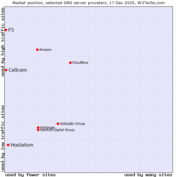 TechnologiesContent ManagementServer-side Languages Client-side Languages JavaScript Libraries CSS Frameworks Web Servers Web Panels Operating Systems Web Hosting Data Centers Reverse Proxies DNS Servers Email Servers SSL Certificate Authorities Content Delivery Traffic Analysis Tools Advertising Networks Tag Managers Social Widgets Site Elements Structured Data Markup Languages Character Encodings Image File Formats Top Level Domains Server Locations Content Languages | Technologies > DNS Servers > Technology usage comparison Comparison of the usage statistics of Hostatom vs. Cellcom vs. F5 for websitesThis report shows the usage statistics of Hostatom vs. Cellcom vs. F5 as DNS server provider on the web. See technologies overview for explanations on the methodologies used in the surveys. Our reports are updated daily. UsageThis diagram shows the percentages of websites using the selected technologies. How to read the diagram:
