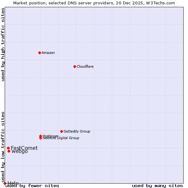 TechnologiesContent ManagementServer-side Languages Client-side Languages JavaScript Libraries CSS Frameworks Web Servers Web Panels Operating Systems Web Hosting Data Centers Reverse Proxies DNS Servers Email Servers SSL Certificate Authorities Content Delivery Traffic Analysis Tools Advertising Networks Tag Managers Social Widgets Site Elements Structured Data Markup Languages Character Encodings Image File Formats Top Level Domains Server Locations Content Languages | Technologies > DNS Servers > Technology usage comparison Comparison of the usage statistics of webgo vs. FastComet vs. Help for websitesThis report shows the usage statistics of webgo vs. FastComet vs. Help as DNS server provider on the web. See technologies overview for explanations on the methodologies used in the surveys. Our reports are updated daily. UsageThis diagram shows the percentages of websites using the selected technologies. How to read the diagram: