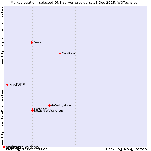 TechnologiesContent ManagementServer-side Languages Client-side Languages JavaScript Libraries CSS Frameworks Web Servers Web Panels Operating Systems Web Hosting Data Centers Reverse Proxies DNS Servers Email Servers SSL Certificate Authorities Content Delivery Traffic Analysis Tools Advertising Networks Tag Managers Social Widgets Site Elements Structured Data Markup Languages Character Encodings Image File Formats Top Level Domains Server Locations Content Languages | Technologies > DNS Servers > Technology usage comparison Comparison of the usage statistics of FastVPS vs. Mivitec vs. Webhost Python for websitesThis report shows the usage statistics of FastVPS vs. Mivitec vs. Webhost Python as DNS server provider on the web. See technologies overview for explanations on the methodologies used in the surveys. Our reports are updated daily. UsageThis diagram shows the percentages of websites using the selected technologies. How to read the diagram:
