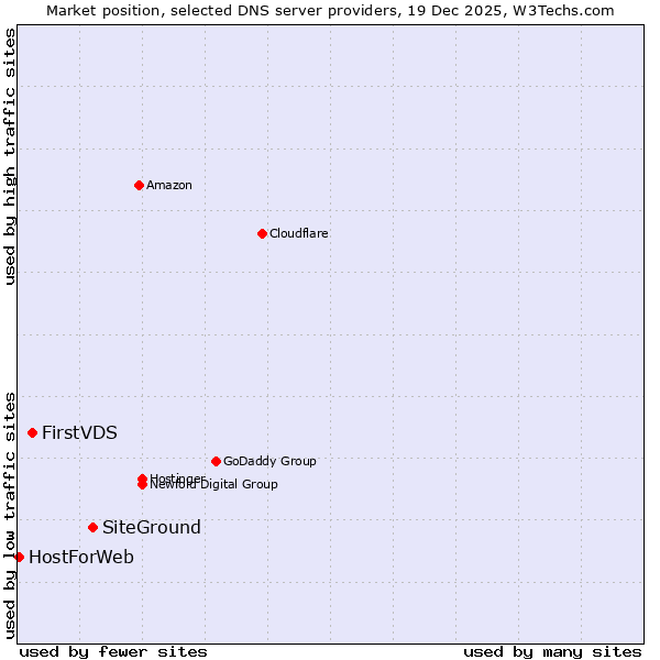 TechnologiesContent ManagementServer-side Languages Client-side Languages JavaScript Libraries CSS Frameworks Web Servers Web Panels Operating Systems Web Hosting Data Centers Reverse Proxies DNS Servers Email Servers SSL Certificate Authorities Content Delivery Traffic Analysis Tools Advertising Networks Tag Managers Social Widgets Site Elements Structured Data Markup Languages Character Encodings Image File Formats Top Level Domains Server Locations Content Languages | Technologies > DNS Servers > Technology usage comparison Comparison of the usage statistics of SiteGround vs. FirstVDS vs. HostForWeb for websitesThis report shows the usage statistics of SiteGround vs. FirstVDS vs. HostForWeb as DNS server provider on the web. See technologies overview for explanations on the methodologies used in the surveys. Our reports are updated daily. UsageThis diagram shows the percentages of websites using the selected technologies. How to read the diagram: