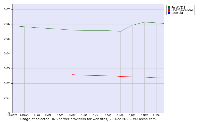 TechnologiesContent ManagementServer-side Languages Client-side Languages JavaScript Libraries CSS Frameworks Web Servers Web Panels Operating Systems Web Hosting Data Centers Reverse Proxies DNS Servers Email Servers SSL Certificate Authorities Content Delivery Traffic Analysis Tools Advertising Networks Tag Managers Social Widgets Site Elements Structured Data Markup Languages Character Encodings Image File Formats Top Level Domains Server Locations Content Languages | Technologies > DNS Servers > Technology usage comparison Comparison of the usage statistics of FirstVDS vs. Hostneverdie vs. Root.lu for websitesThis report shows the usage statistics of FirstVDS vs. Hostneverdie vs. Root.lu as DNS server provider on the web. See technologies overview for explanations on the methodologies used in the surveys. Our reports are updated daily. UsageThis diagram shows the percentages of websites using the selected technologies. How to read the diagram: