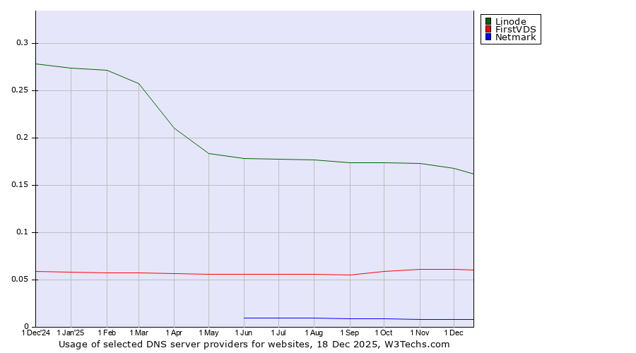 TechnologiesContent ManagementServer-side Languages Client-side Languages JavaScript Libraries CSS Frameworks Web Servers Web Panels Operating Systems Web Hosting Data Centers Reverse Proxies DNS Servers Email Servers SSL Certificate Authorities Content Delivery Traffic Analysis Tools Advertising Networks Tag Managers Social Widgets Site Elements Structured Data Markup Languages Character Encodings Image File Formats Top Level Domains Server Locations Content Languages | Technologies > DNS Servers > Technology usage comparison Comparison of the usage statistics of Linode vs. FirstVDS vs. Netmark for websitesThis report shows the usage statistics of Linode vs. FirstVDS vs. Netmark as DNS server provider on the web. See technologies overview for explanations on the methodologies used in the surveys. Our reports are updated daily. UsageThis diagram shows the percentages of websites using the selected technologies. How to read the diagram: