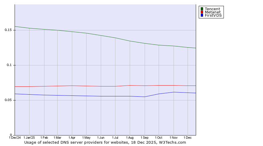TechnologiesContent ManagementServer-side Languages Client-side Languages JavaScript Libraries CSS Frameworks Web Servers Web Panels Operating Systems Web Hosting Data Centers Reverse Proxies DNS Servers Email Servers SSL Certificate Authorities Content Delivery Traffic Analysis Tools Advertising Networks Tag Managers Social Widgets Site Elements Structured Data Markup Languages Character Encodings Image File Formats Top Level Domains Server Locations Content Languages | Technologies > DNS Servers > Technology usage comparison Comparison of the usage statistics of Tencent vs. Metanet vs. FirstVDS for websitesThis report shows the usage statistics of Tencent vs. Metanet vs. FirstVDS as DNS server provider on the web. See technologies overview for explanations on the methodologies used in the surveys. Our reports are updated daily. UsageThis diagram shows the percentages of websites using the selected technologies. How to read the diagram: