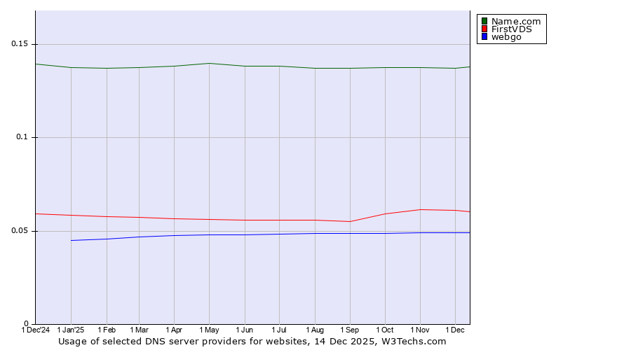 TechnologiesContent ManagementServer-side Languages Client-side Languages JavaScript Libraries CSS Frameworks Web Servers Web Panels Operating Systems Web Hosting Data Centers Reverse Proxies DNS Servers Email Servers SSL Certificate Authorities Content Delivery Traffic Analysis Tools Advertising Networks Tag Managers Social Widgets Site Elements Structured Data Markup Languages Character Encodings Image File Formats Top Level Domains Server Locations Content Languages | Technologies > DNS Servers > Technology usage comparison Comparison of the usage statistics of Name.com vs. FirstVDS vs. webgo for websitesThis report shows the usage statistics of Name.com vs. FirstVDS vs. webgo as DNS server provider on the web. See technologies overview for explanations on the methodologies used in the surveys. Our reports are updated daily. UsageThis diagram shows the percentages of websites using the selected technologies. How to read the diagram: