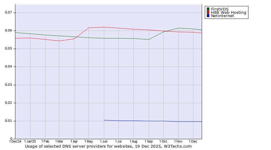TechnologiesContent ManagementServer-side Languages Client-side Languages JavaScript Libraries CSS Frameworks Web Servers Web Panels Operating Systems Web Hosting Data Centers Reverse Proxies DNS Servers Email Servers SSL Certificate Authorities Content Delivery Traffic Analysis Tools Advertising Networks Tag Managers Social Widgets Site Elements Structured Data Markup Languages Character Encodings Image File Formats Top Level Domains Server Locations Content Languages | Technologies > DNS Servers > Technology usage comparison Comparison of the usage statistics of FirstVDS vs. H88 Web Hosting vs. Netinternet for websitesThis report shows the usage statistics of FirstVDS vs. H88 Web Hosting vs. Netinternet as DNS server provider on the web. See technologies overview for explanations on the methodologies used in the surveys. Our reports are updated daily. UsageThis diagram shows the percentages of websites using the selected technologies. How to read the diagram: