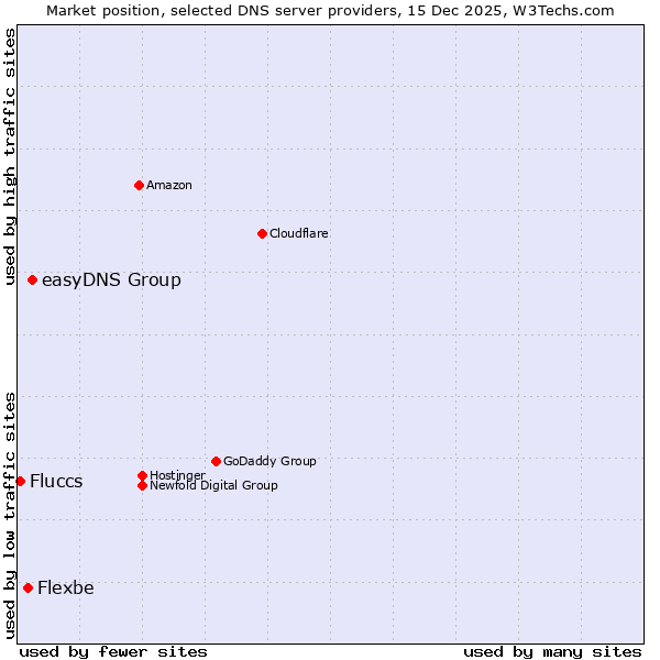 TechnologiesContent ManagementServer-side Languages Client-side Languages JavaScript Libraries CSS Frameworks Web Servers Web Panels Operating Systems Web Hosting Data Centers Reverse Proxies DNS Servers Email Servers SSL Certificate Authorities Content Delivery Traffic Analysis Tools Advertising Networks Tag Managers Social Widgets Site Elements Structured Data Markup Languages Character Encodings Image File Formats Top Level Domains Server Locations Content Languages | Technologies > DNS Servers > Technology usage comparison Comparison of the usage statistics of easyDNS Group vs. Flexbe vs. Fluccs for websitesThis report shows the usage statistics of easyDNS Group vs. Flexbe vs. Fluccs as DNS server provider on the web. See technologies overview for explanations on the methodologies used in the surveys. Our reports are updated daily. UsageThis diagram shows the percentages of websites using the selected technologies. How to read the diagram: