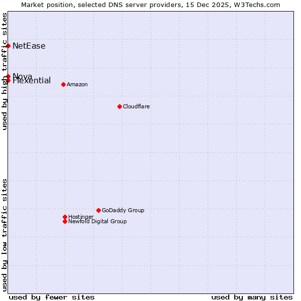 TechnologiesContent ManagementServer-side Languages Client-side Languages JavaScript Libraries CSS Frameworks Web Servers Web Panels Operating Systems Web Hosting Data Centers Reverse Proxies DNS Servers Email Servers SSL Certificate Authorities Content Delivery Traffic Analysis Tools Advertising Networks Tag Managers Social Widgets Site Elements Structured Data Markup Languages Character Encodings Image File Formats Top Level Domains Server Locations Content Languages | Technologies > DNS Servers > Technology usage comparison Comparison of the usage statistics of Flexential vs. NetEase vs. Nova for websitesThis report shows the usage statistics of Flexential vs. NetEase vs. Nova as DNS server provider on the web. See technologies overview for explanations on the methodologies used in the surveys. Our reports are updated daily. UsageThis diagram shows the percentages of websites using the selected technologies. How to read the diagram: