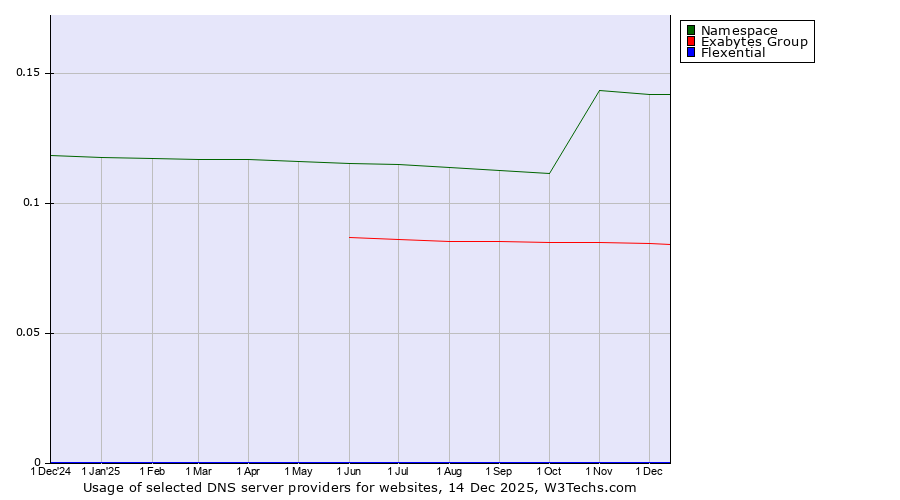 TechnologiesContent ManagementServer-side Languages Client-side Languages JavaScript Libraries CSS Frameworks Web Servers Web Panels Operating Systems Web Hosting Data Centers Reverse Proxies DNS Servers Email Servers SSL Certificate Authorities Content Delivery Traffic Analysis Tools Advertising Networks Tag Managers Social Widgets Site Elements Structured Data Markup Languages Character Encodings Image File Formats Top Level Domains Server Locations Content Languages | Technologies > DNS Servers > Technology usage comparison Comparison of the usage statistics of Namespace vs. Exabytes Group vs. Flexential for websitesThis report shows the usage statistics of Namespace vs. Exabytes Group vs. Flexential as DNS server provider on the web. See technologies overview for explanations on the methodologies used in the surveys. Our reports are updated daily. UsageThis diagram shows the percentages of websites using the selected technologies. How to read the diagram: