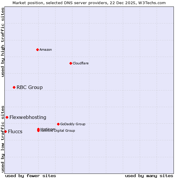 TechnologiesContent ManagementServer-side Languages Client-side Languages JavaScript Libraries CSS Frameworks Web Servers Web Panels Operating Systems Web Hosting Data Centers Reverse Proxies DNS Servers Email Servers SSL Certificate Authorities Content Delivery Traffic Analysis Tools Advertising Networks Tag Managers Social Widgets Site Elements Structured Data Markup Languages Character Encodings Image File Formats Top Level Domains Server Locations Content Languages | Technologies > DNS Servers > Technology usage comparison Comparison of the usage statistics of RBC Group vs. Flexwebhosting vs. Fluccs for websitesThis report shows the usage statistics of RBC Group vs. Flexwebhosting vs. Fluccs as DNS server provider on the web. See technologies overview for explanations on the methodologies used in the surveys. Our reports are updated daily. UsageThis diagram shows the percentages of websites using the selected technologies. How to read the diagram:
