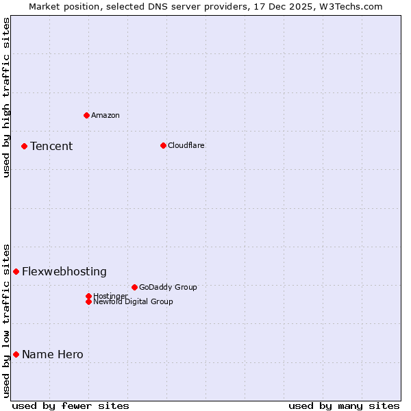 TechnologiesContent ManagementServer-side Languages Client-side Languages JavaScript Libraries CSS Frameworks Web Servers Web Panels Operating Systems Web Hosting Data Centers Reverse Proxies DNS Servers Email Servers SSL Certificate Authorities Content Delivery Traffic Analysis Tools Advertising Networks Tag Managers Social Widgets Site Elements Structured Data Markup Languages Character Encodings Image File Formats Top Level Domains Server Locations Content Languages | Technologies > DNS Servers > Technology usage comparison Comparison of the usage statistics of Tencent vs. Name Hero vs. Flexwebhosting for websitesThis report shows the usage statistics of Tencent vs. Name Hero vs. Flexwebhosting as DNS server provider on the web. See technologies overview for explanations on the methodologies used in the surveys. Our reports are updated daily. UsageThis diagram shows the percentages of websites using the selected technologies. How to read the diagram: