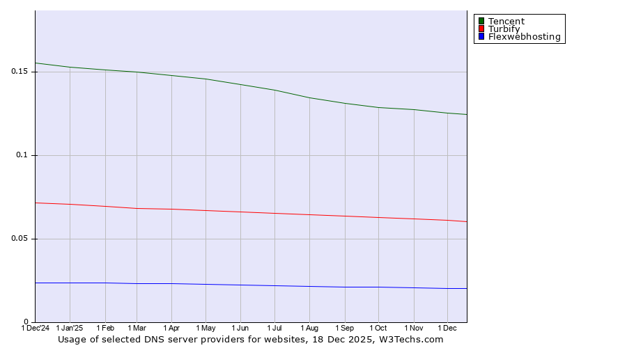 TechnologiesContent ManagementServer-side Languages Client-side Languages JavaScript Libraries CSS Frameworks Web Servers Web Panels Operating Systems Web Hosting Data Centers Reverse Proxies DNS Servers Email Servers SSL Certificate Authorities Content Delivery Traffic Analysis Tools Advertising Networks Tag Managers Social Widgets Site Elements Structured Data Markup Languages Character Encodings Image File Formats Top Level Domains Server Locations Content Languages | Technologies > DNS Servers > Technology usage comparison Comparison of the usage statistics of Tencent vs. Turbify vs. Flexwebhosting for websitesThis report shows the usage statistics of Tencent vs. Turbify vs. Flexwebhosting as DNS server provider on the web. See technologies overview for explanations on the methodologies used in the surveys. Our reports are updated daily. UsageThis diagram shows the percentages of websites using the selected technologies. How to read the diagram:
