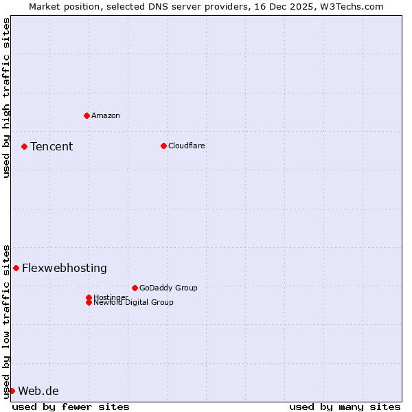 TechnologiesContent ManagementServer-side Languages Client-side Languages JavaScript Libraries CSS Frameworks Web Servers Web Panels Operating Systems Web Hosting Data Centers Reverse Proxies DNS Servers Email Servers SSL Certificate Authorities Content Delivery Traffic Analysis Tools Advertising Networks Tag Managers Social Widgets Site Elements Structured Data Markup Languages Character Encodings Image File Formats Top Level Domains Server Locations Content Languages | Technologies > DNS Servers > Technology usage comparison Comparison of the usage statistics of Tencent vs. Flexwebhosting vs. Web.de for websitesThis report shows the usage statistics of Tencent vs. Flexwebhosting vs. Web.de as DNS server provider on the web. See technologies overview for explanations on the methodologies used in the surveys. Our reports are updated daily. UsageThis diagram shows the percentages of websites using the selected technologies. How to read the diagram: